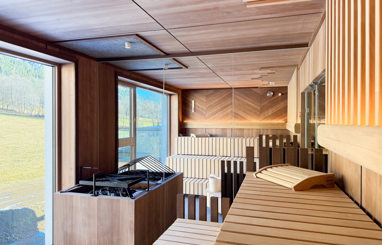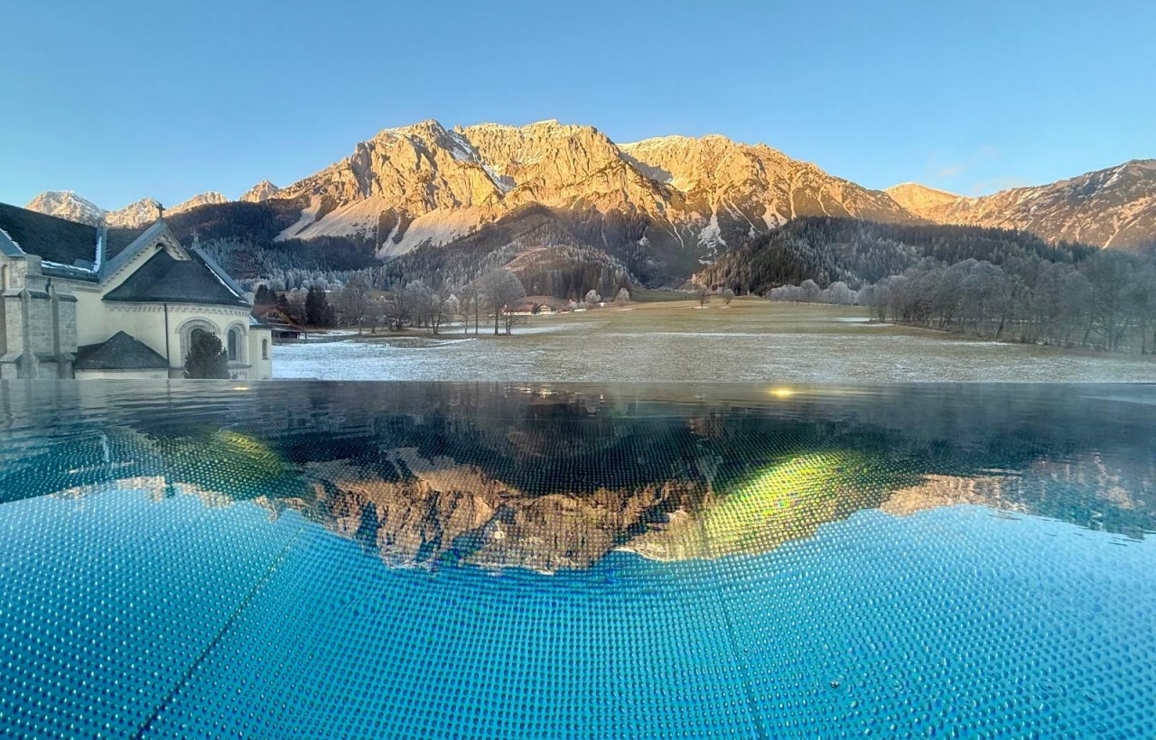 - Winter-Wellnessoase mit Sauna, Dampfbad, Salzlounge und Panoramablick auf Dachstein und Schladminger Tauern.